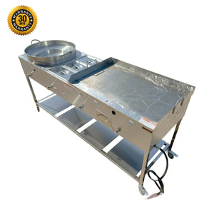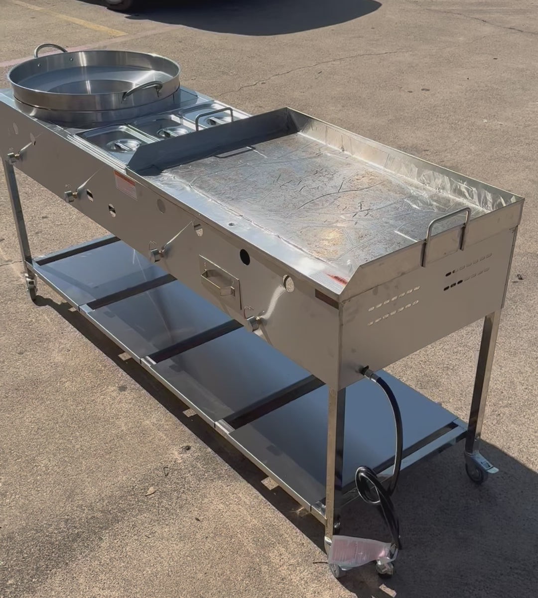 High Heat Output: Heated by two heavy-duty H-shaped cast iron burners, providing a total of 150,000 BTUs for even cooking. The comal and the 3 pan steam table are heated by 30,000 BTU burners each.